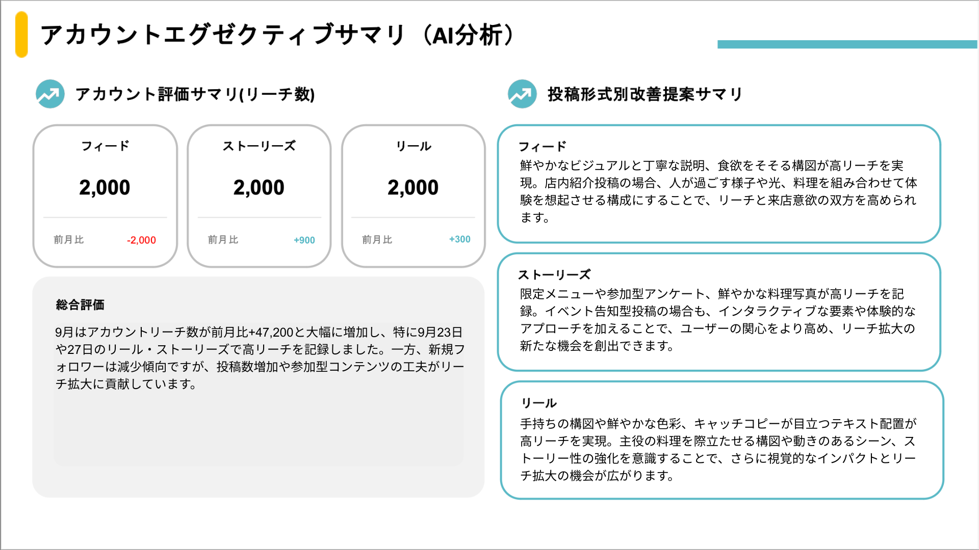 - 投稿データの自動解析:前月以前のInstagram投稿を対象に、AIがアカウント全体および投稿形式別の運用状況を整理