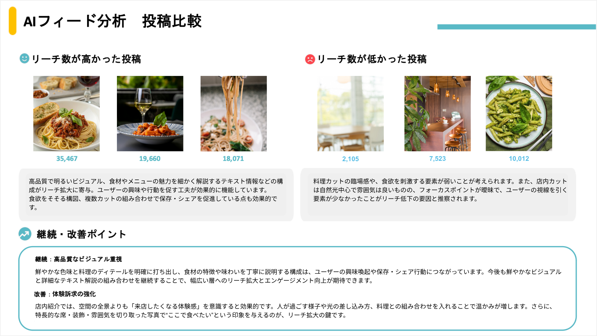 - パフォーマンス分類と傾向分析:投稿の成果をもとに、上位・下位の投稿を自動分類し、それぞれの共通点や改善案を提示